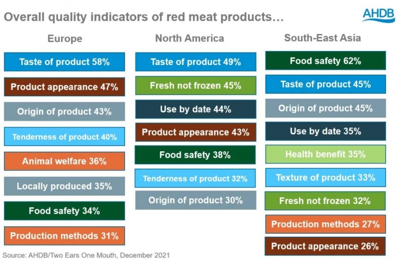 举例而言,东南亚的消费者将食品安全作为评断红肉品质的关键指标,而在欧洲,食品安全只是评断红肉商品的一个次要因素,在品质的评价指标上排序较为靠后,口味以及产品外观等则是他们更重视的。