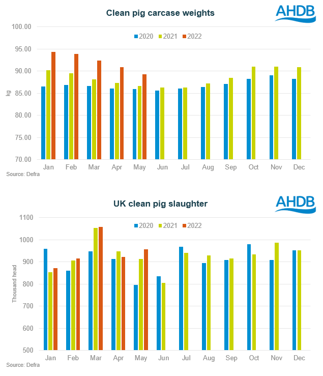 综合以上各种因素,迄今为止猪肉总产量达到了452,200吨,比去年同期增长6%。生猪屠宰量为473万头,同比仅增长了1%,由此可见,较重的胴体重量是造成产量增长的主要原因。